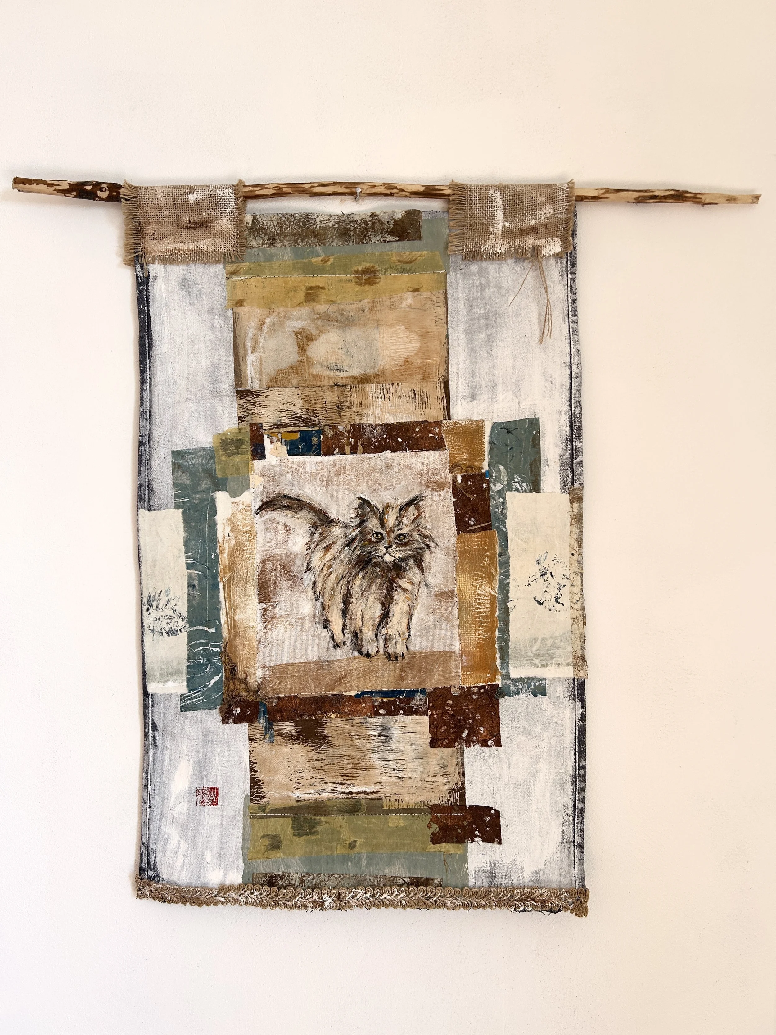 Shared Moments celebrates the quiet bond between humans and animals. Inspired by Mona, my rescued cat, this mixed media collage layers vintage linen, hand-printed papers, found textiles, and delicate stitching. Each element — the hand-painted motif, soft silk pieces, and jute threads — reflects a mutual presence and gentle trust, a shared rhythm in creation and life. The piece invites viewers to pause and honor the intimate connections that often go unnoticed.
