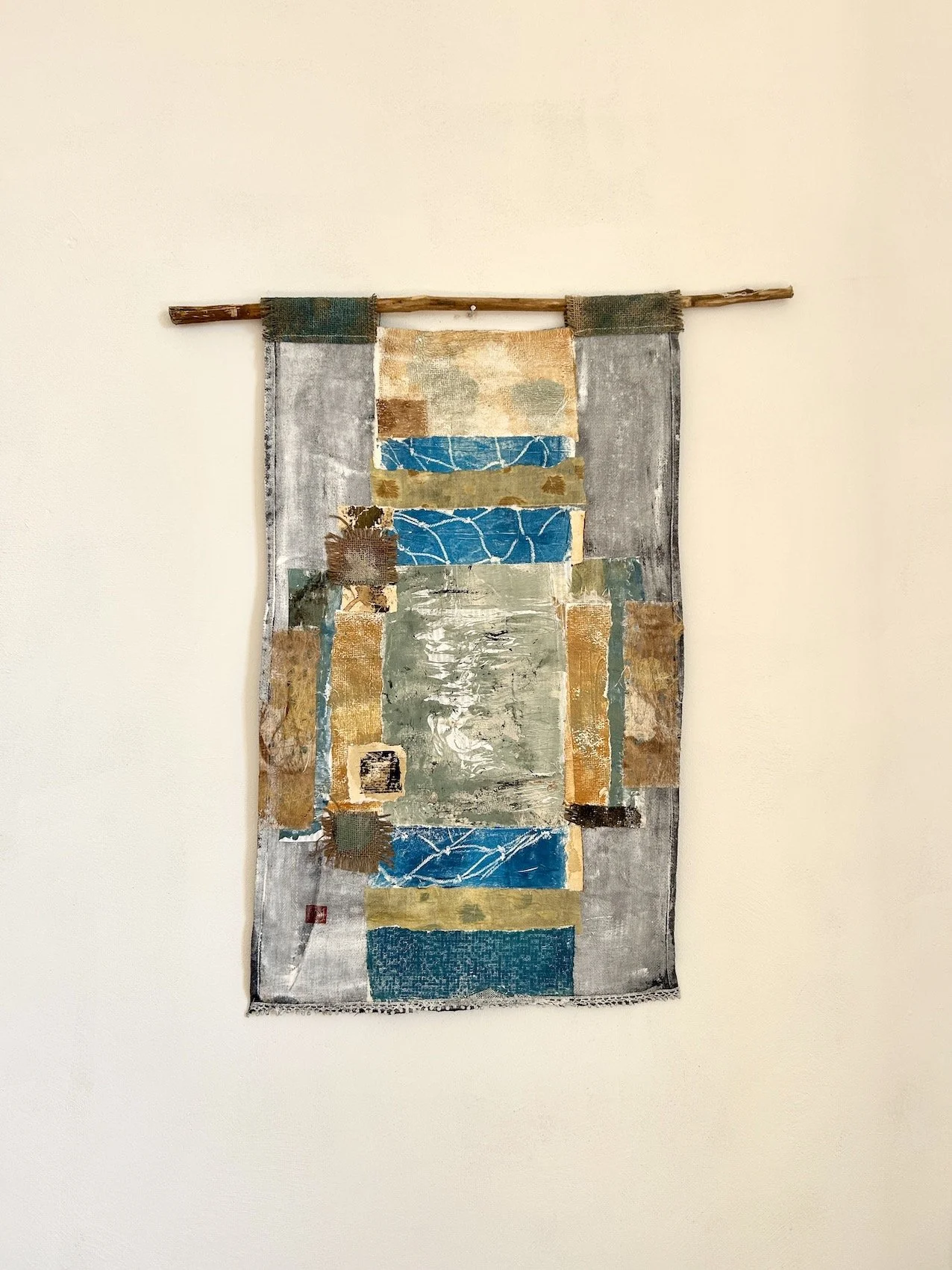 “Threshold”, 2025, Mixed media collage on prepared vintage linen, handmade brushwork, machine stitching, hand-printed lino motifs, hand-printed textiles, found materials