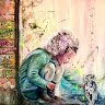 This collage composition moves like a quiet rhythm—an abstract landscape of memory and breath. At its center, expressive brushstrokes in black and white sweep across a kaki-toned ground, painted on cotton cloth once worn as a pyjama. The mark-making, done with a self-made brush, evokes the pulse of a heartbeat—fluid yet intentional. Gentle hand stitches run across the surface, adding texture and presence, like silent notations on a musical score. In the left corner, a small leaf form—once part of an earring—is transformed with delicate gold leaf, catching the light and drawing the eye. Flecks of the same gilding appear along the black wooden frame, subtly balancing the composition and covering traces of time. Soft fragments of pink silk sari introduce a warm counterpoint, woven with hand-painted textiles and paper in your signature layered style. Timeless invites the viewer into a meditation on beauty, repair, and the quiet marks left by a lived life.