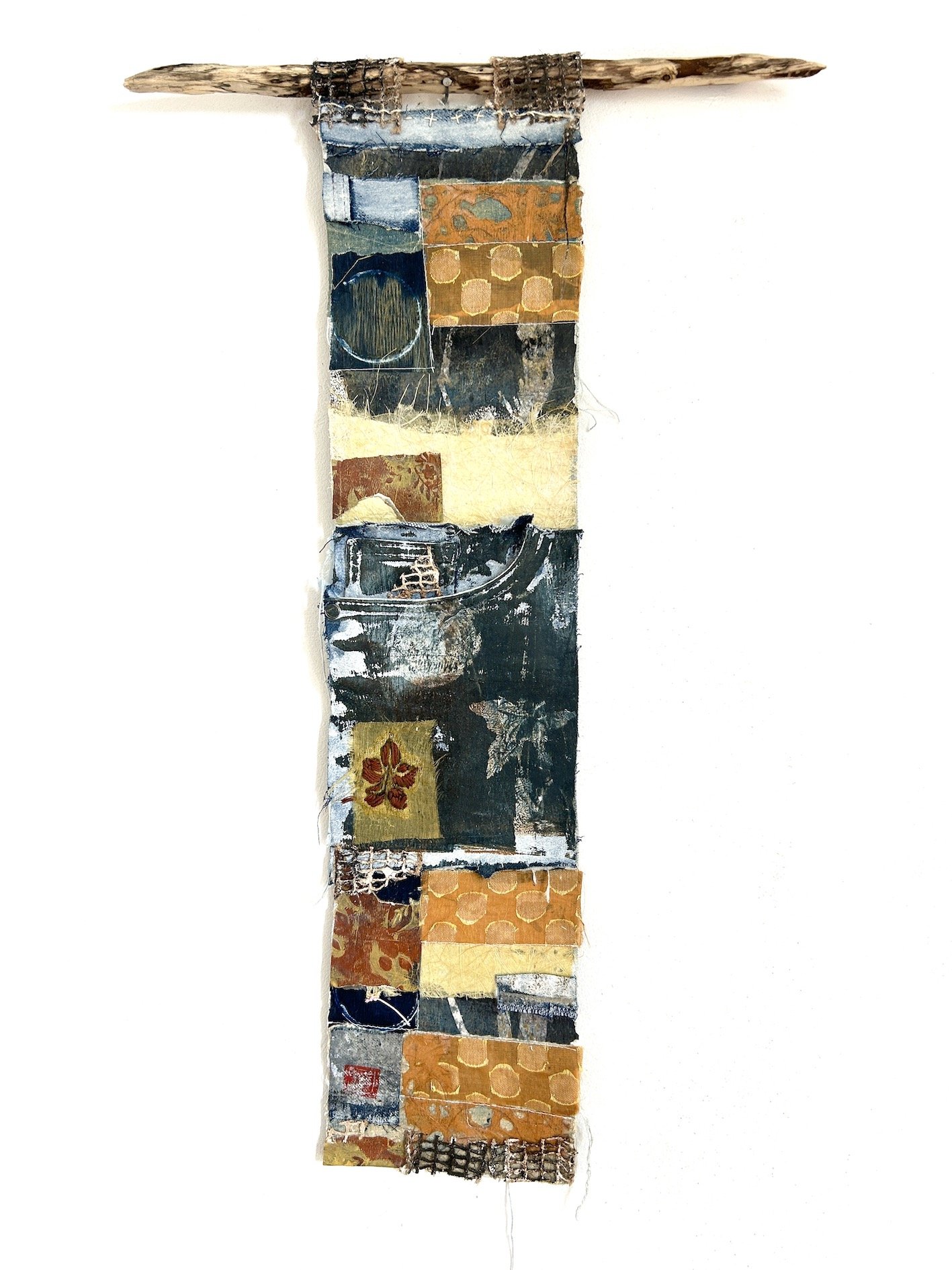 „Wispering Between Worlds“: A front pocket from old jeans—transformed through gel plate printing and pressed wildflowers—anchors this piece in quiet memory. Above, a leaf and moon-like form emerge in a twilight palette of kaki and blue, inviting a dreamlike stillness. A burgundy hand-stitched flower on golden-yellow silk nestles in the corner, in silent communion with the moon-leaf shape, forming a triad that hums with unseen connection.